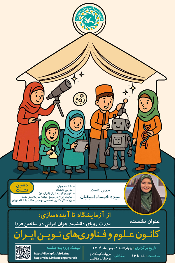 دهمین نشست ترویجی کانون علوم و فناوری های نوین ایران «کافنا گپ» با موضوع «از آزمایشگاه تا آیندهسازی: قدرت رویای دانشمند جوان ایرانی در ساختن فردا» برگزار می گردد.